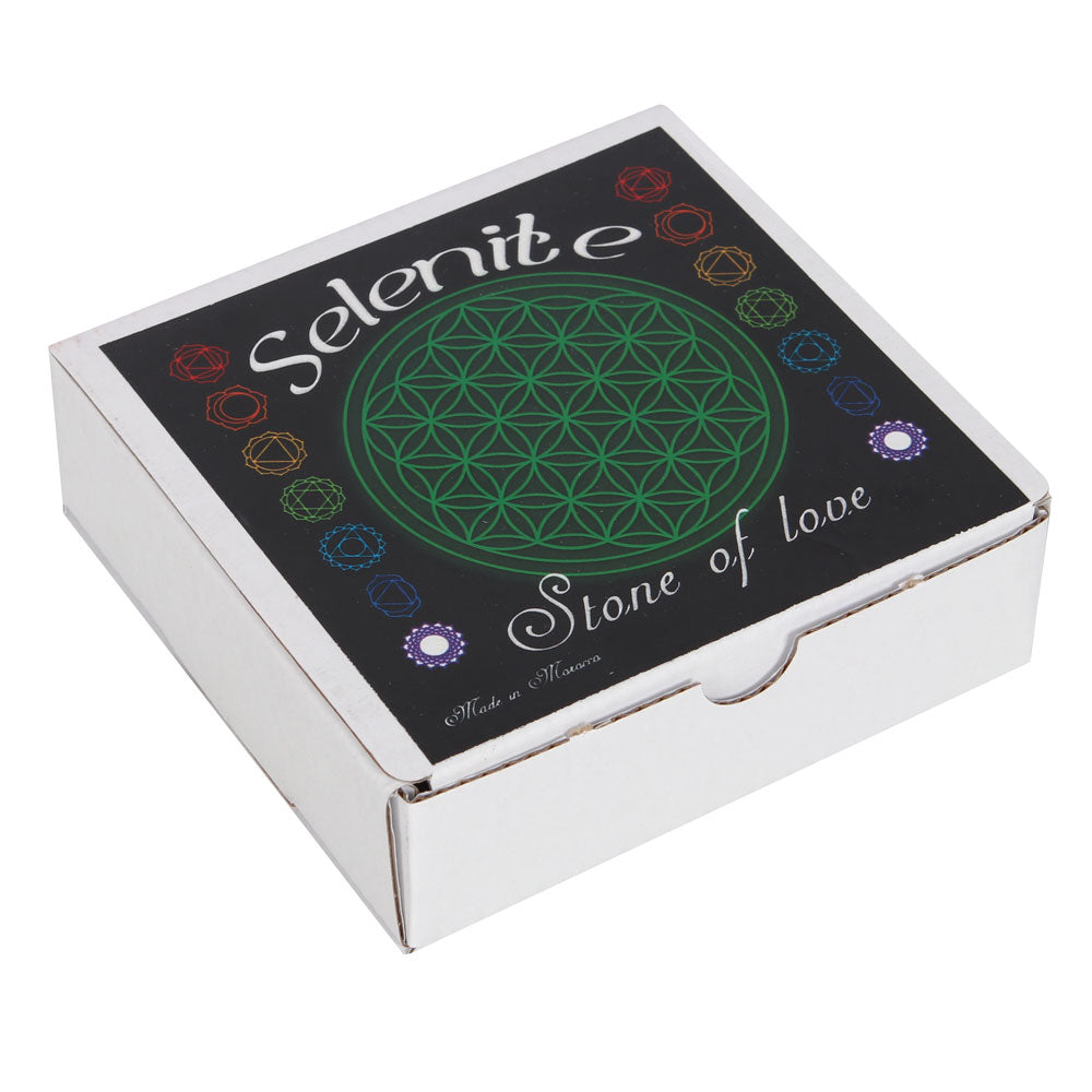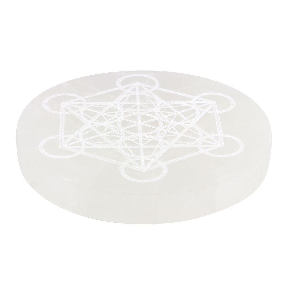 • This beautiful circular selenite crystal charging plate features a white Metatron's Cube design which is often favoured for crystal charging plates as it represents the flow of energy and connection with the divine. Use to charge and amplify the energy in your crystals or clear them of negative energy.