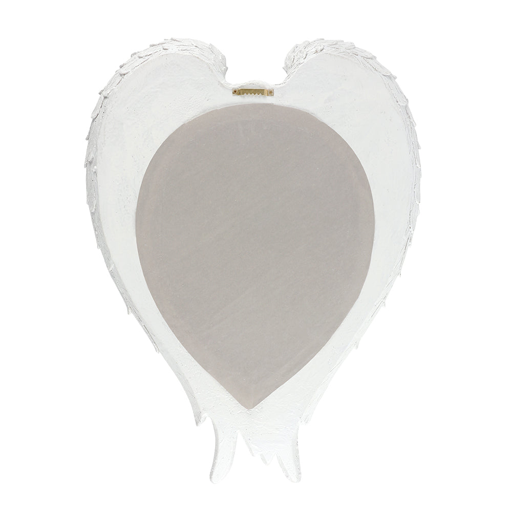 • A stunning and impactful angel wing wall mirror. The mirror is nestled between two large angel wings, finished in white and accented with glitter to add sparkle to the elegant and eye-catching design.
